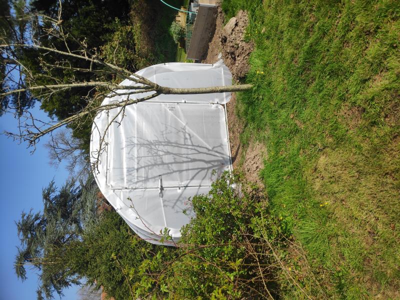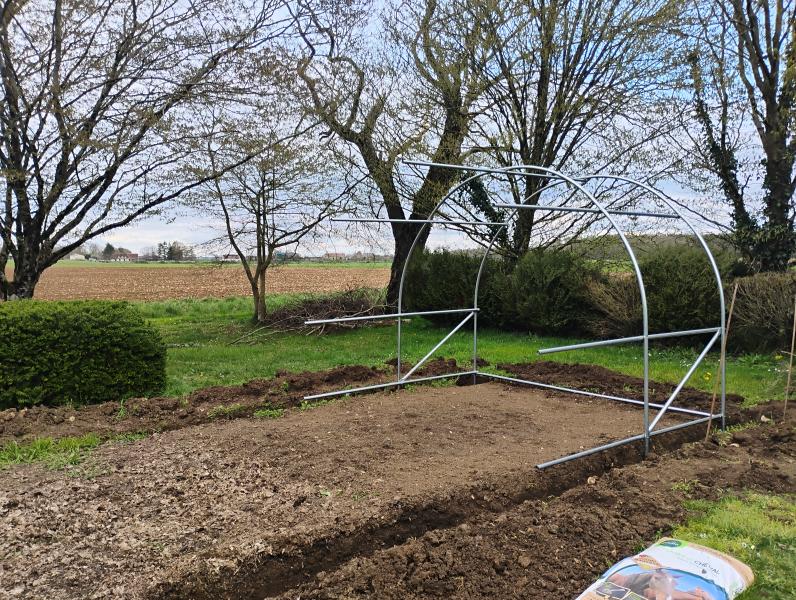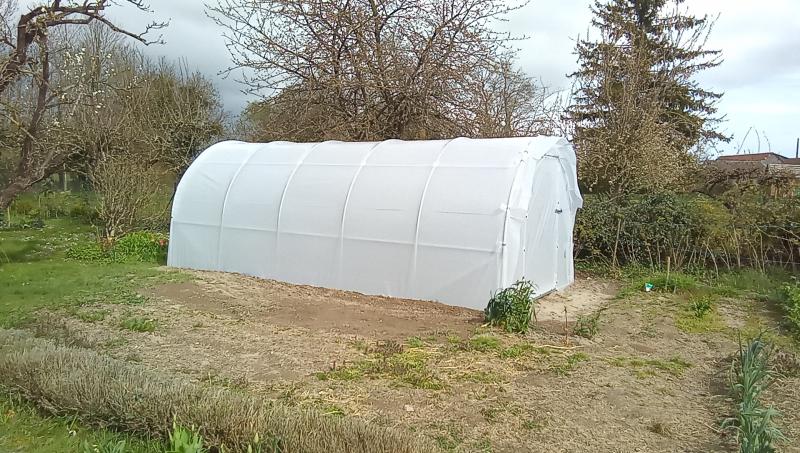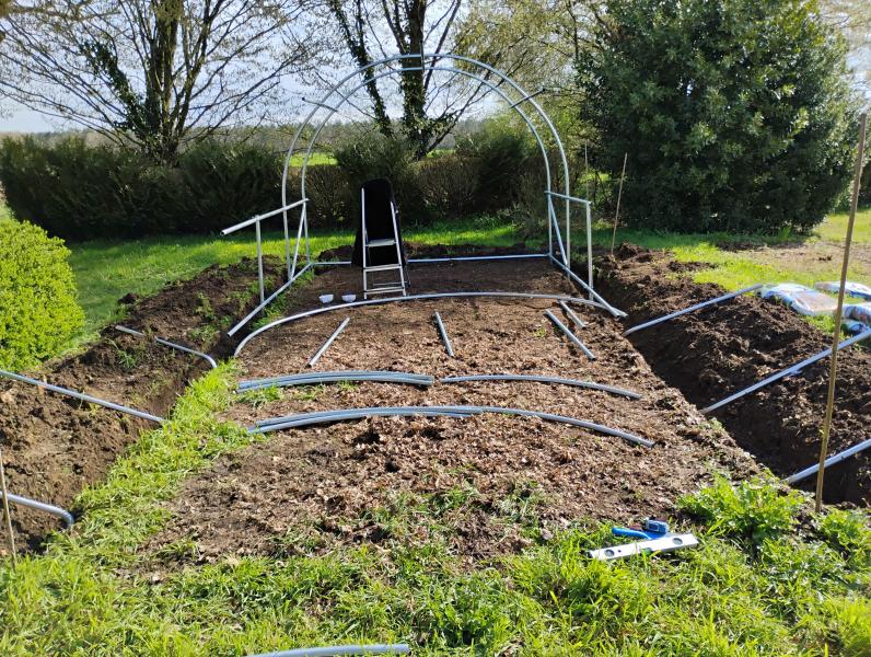 Commencé le montage le 17 mars terminé hier le 24 mars, par 2 novices de 70ans😉. Reste à raccourcir les débords de bâche et les pansements.