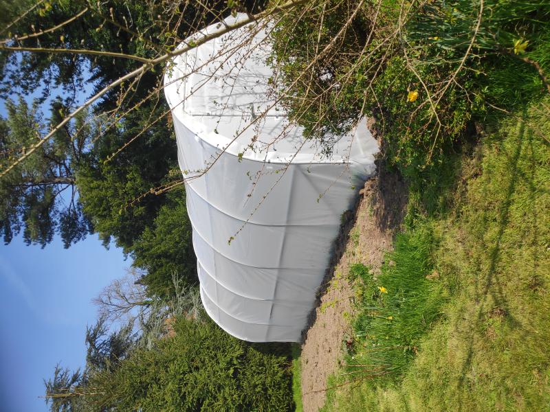 - Bâche Polyéthylène (PE) Diffusante Thermique 200 microns, film 7 couches de qualité professionnelle, fabrication européenne ; filtration anti-UV certifiée à la norme UPF50 (Garantie 5 ans) OU - Fixation de la bâche du dôme avec ourlet et cordelettes. Et pignons avec clips en inox |