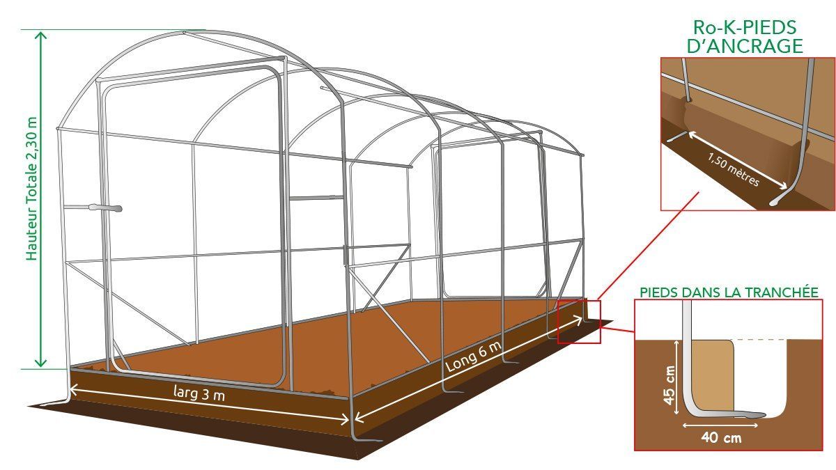 • Pieds coudés à l'extrémité de chaque arceaux pour un ancrage au sol de qualité . Une exclusivité de Serres LA FRANCAISE, ils offrent une extrême stabilité à votre serre.