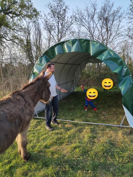 Concernant l’appréhension des ânesses, c’est tout à fait normal au début : un peu de temps, quelques friandises et elles devraient rapidement adopter leur nouvel abri 🐴