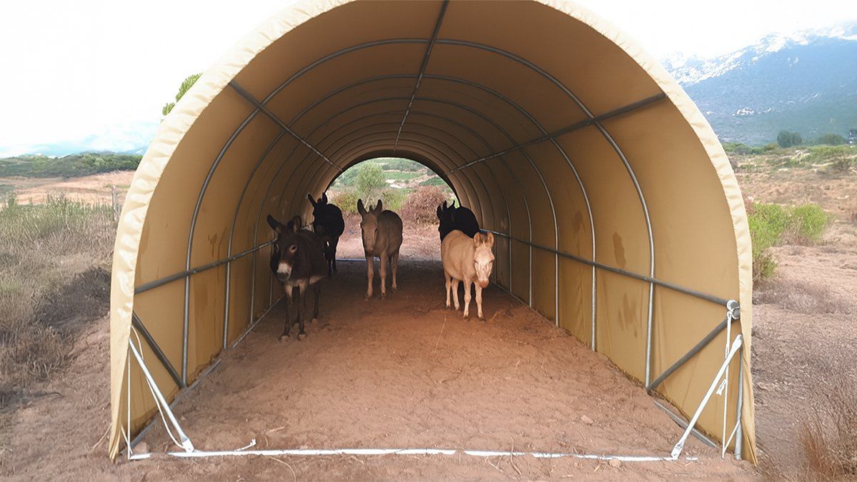 tunnel pour abriter des chevauxLe tunnel a été monté en 1 journée, j ai mis 1 cheval qui a des le 1er jour commencé à grignoter de tous coté la bâche, j'ai changé avec un autre cheval et celui ci n'y touche pas. Les chevaux apprécient l'espace. je recommande car c'est économique et vite installé.