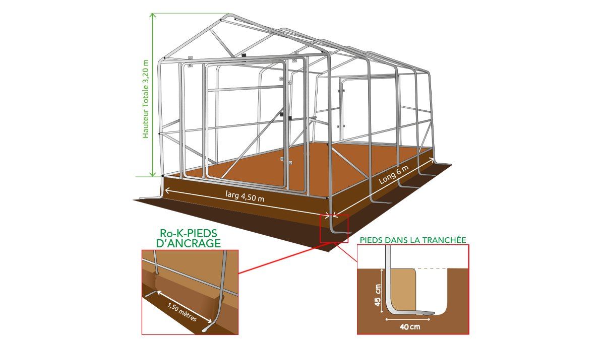 - Pieds coudés à chaque arceau pour un ancrage de qualité